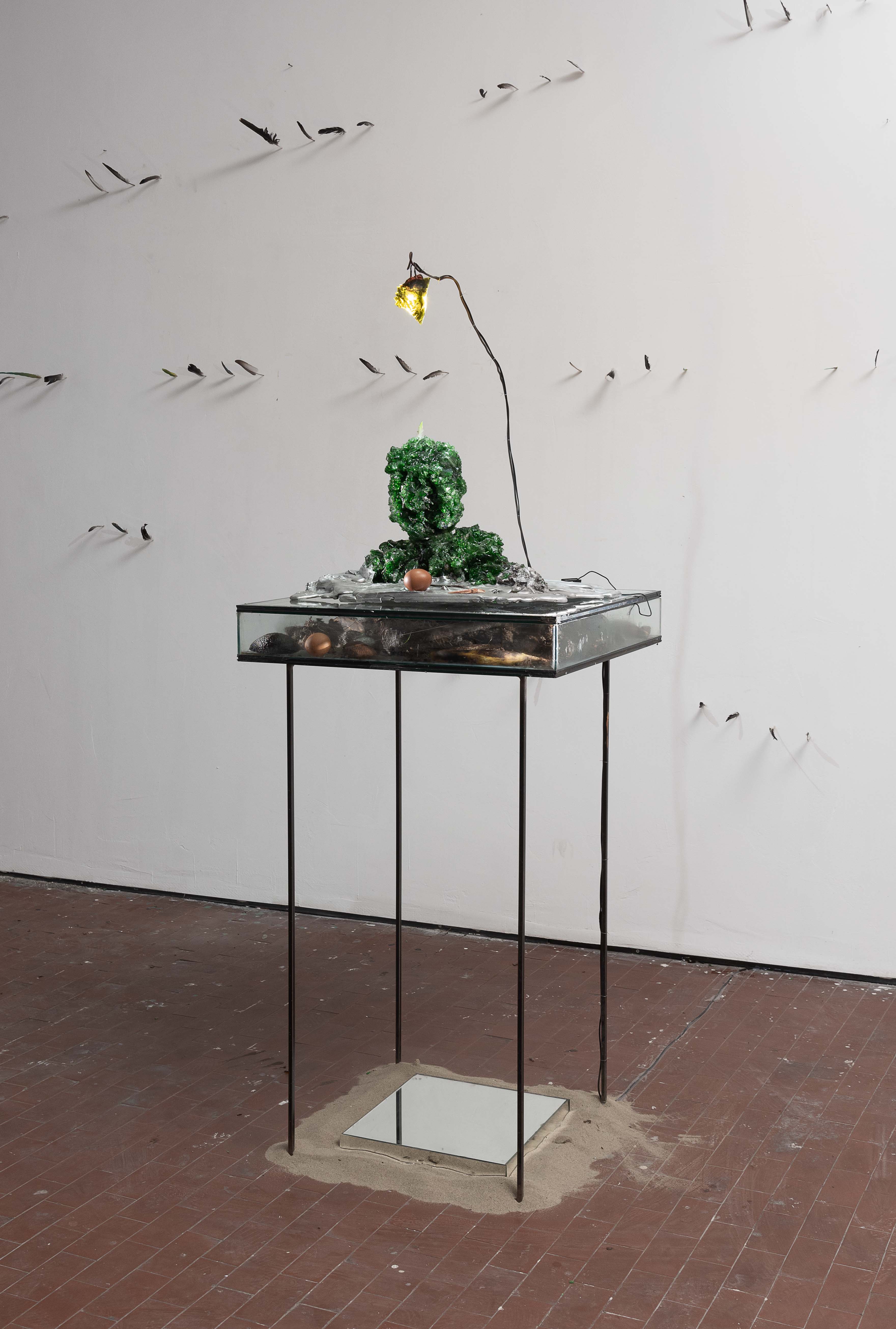 Stones and water from the Saturnia thermal baths, Grosseto ︎ Glass bottles. ︎ Aluminum: parts from obsolete car engines. Provided by Simone Miccioni Bodywork, Marino RM. ︎ The fusion was carried out on the coast of the Tiber River, Piazzale Ponte Emilio ancient Pons Aemilius, II B.C. ︎ Glass: 88 bottles of beer and wine collected in plazas [limited life situations]. And viewpoints of the city of Rome and tourist centers with historical value. ︎ Pigeon feathers, parrots ︎ Fish skin ︎ Melon ︎ Sand on Torvaianica beach, RM.